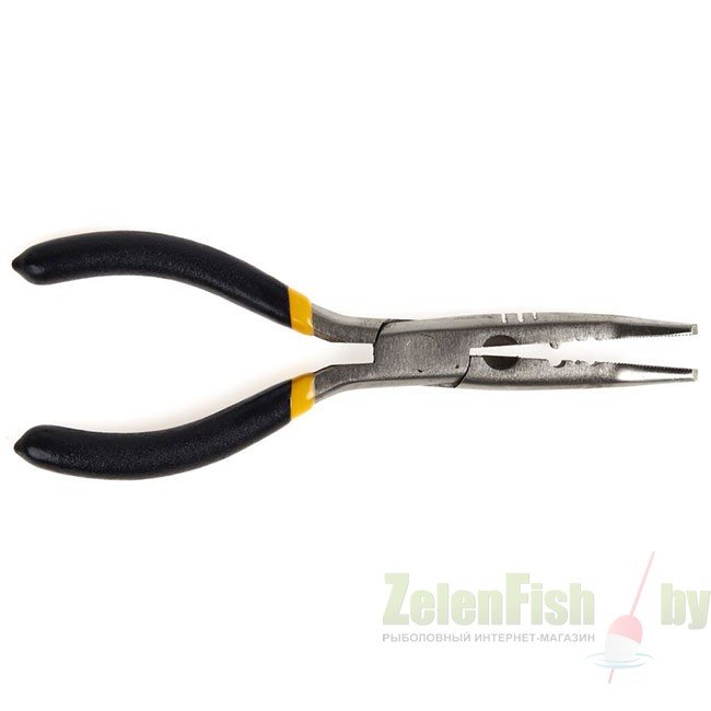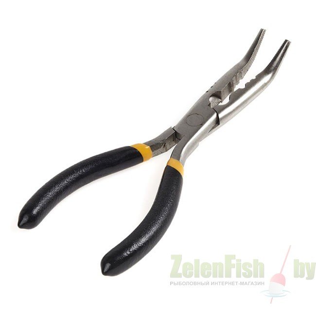 Металлический рыболовный экстрактор в форме щипцов. Изогнутые губки экстрактора облегчают процесс извлечения крючка из зубастой пасти щуки. Экстрактор оборудован приспособлением для опрессовки обжимных трубочек при изготовлении различных рыболовных оснасток, а также резаком для перерезания лески и плетенки.