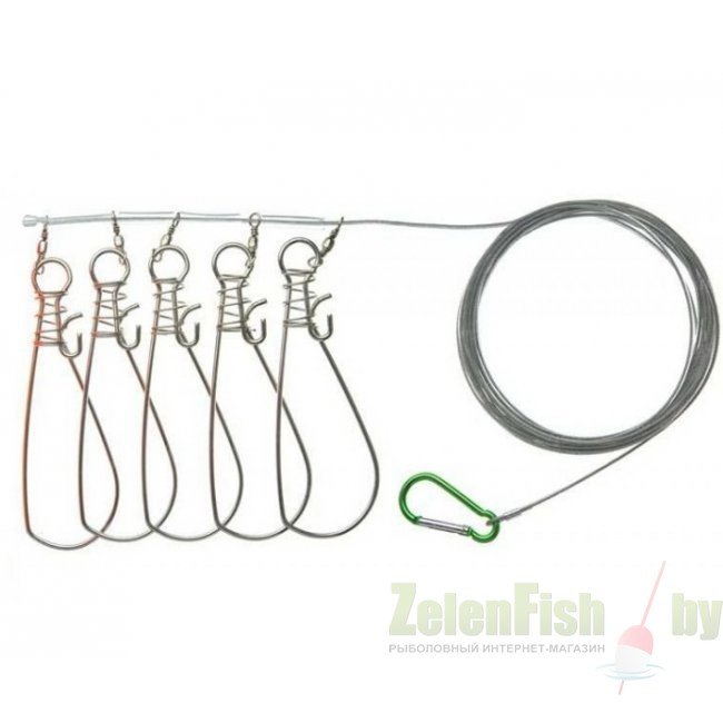 Кукан рыболовный используется для длительного хранения рыбы в живом состоянии. Состоит из металлического троса длиной 5м, имеет 5 металлических застежек и карабин.
