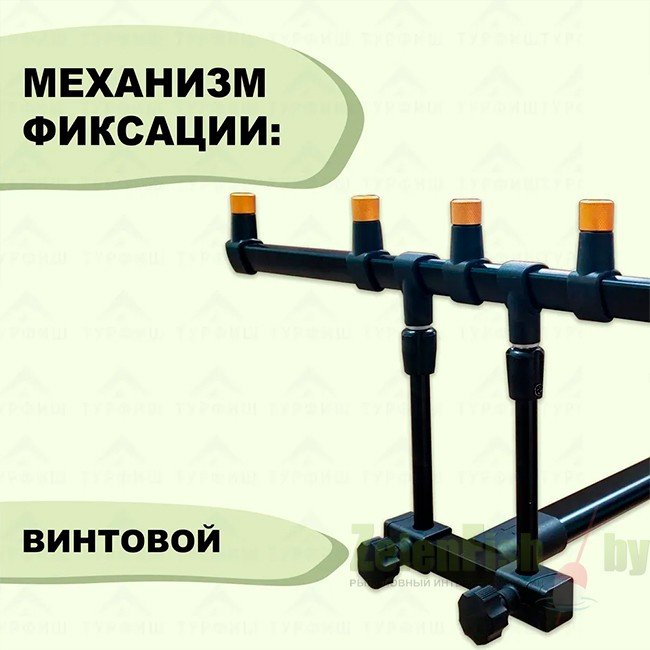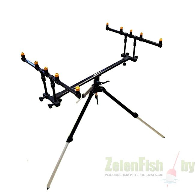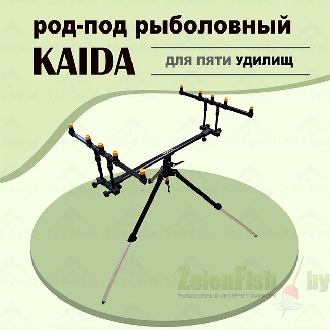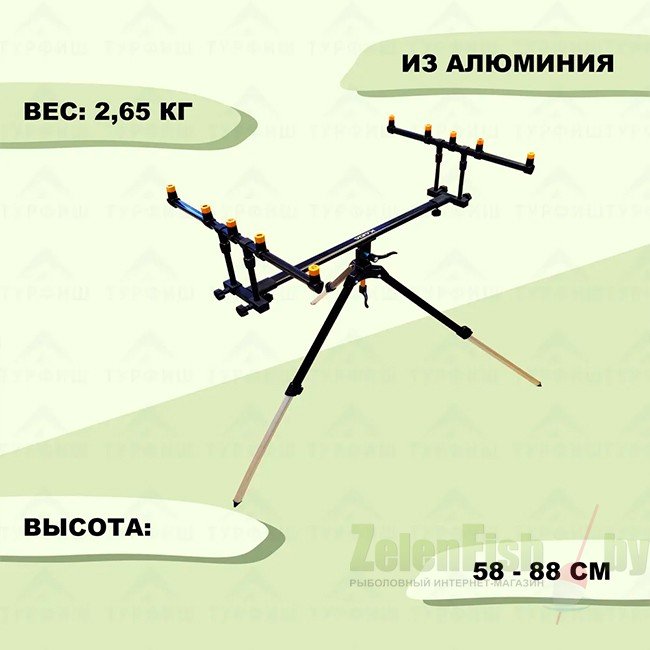 Род-под усиленной конструкции из алюминиевого сплава на 5 удилищ. Крепкая и надежная конструкция с телескопической регулировкой. Усиленная крепёжная фурнитура всех соединений обеспечивает высокую стабильность и прочность конструкции. Конструкцией предусмотрены регулировки по наклону и высоте. Раздельно регулируемые съемные ноги позволяют установить род-под в самых различных вариантах и на неровных поверхностях. Род под опирается на треногу, с качественным шарниром, который позволяет подставке вращаться на 360 градусов.
