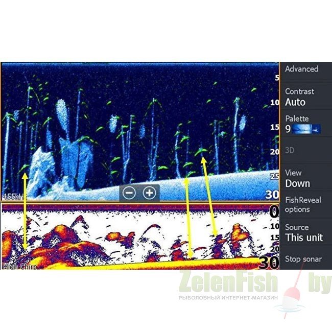 Теперь рыбу еще легче найти и идентифицировать с помощью функции FishReveal. Она объединяет на одном экране проверенную временем эффективность эхолота CHIRP и структурное сканирование высокого разрешения DownScan Imaging. Таким образом, даже в режиме нижнего сканирования, вы увидите на экране рыбу, отображенную в виде дуг.