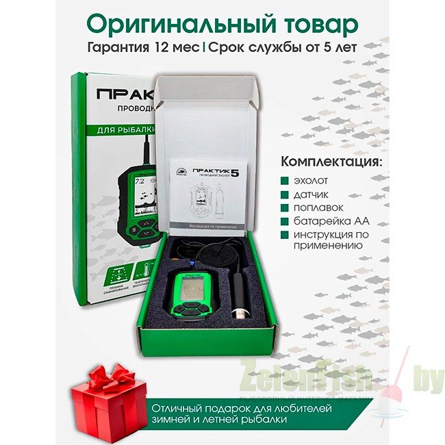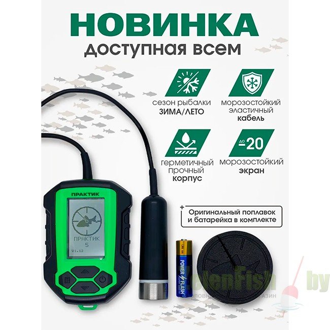 В комплектацию входит: Эхолот Практик 5 (Блок-приемник с кабелем и датчиком), Батарейка АА, Поплавок Практик, Инструкция на русском языке.