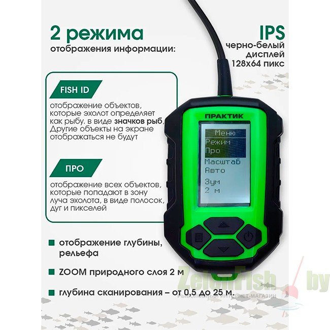 Полноценный эхолот. Обладает всем необходимым функционалом, для ловли рыбы, как летом и зимой.