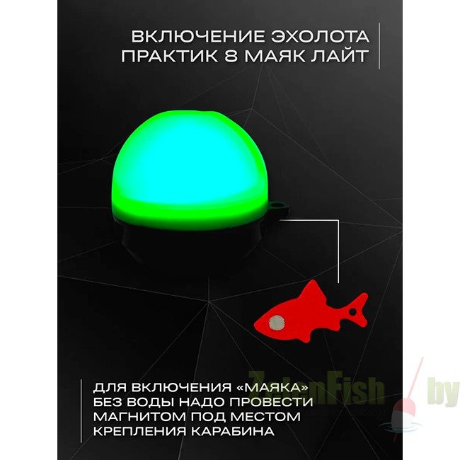 - Два способа включения эхолота: автоматически от воды, либо с помощью специального магнита, входящего в комплектацию.