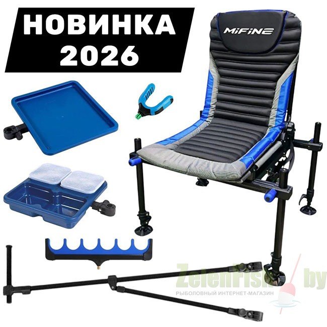 В 2026 году компания выпускает обновленную комплектацию кресла. Помимо самого Mifine Vulcan 55090, в комплект входят самые необходимые обвесы для комфортной ловли: универсальный столик, столик для наживки с 2-мя емкостями, фидер-арм, гребенка и подставка под комель.