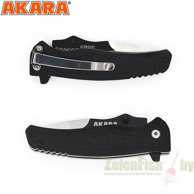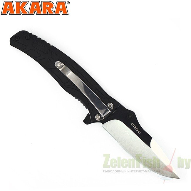 Складной карманный нож Akara Croc. Лезвие с прямой заточкой изготовлено из высококачественной нержавеющей стали марки 5Cr15MoV и имеет частичное защитное черное антибликовое покрытие в верхней части. Алюминиевая рукоять с покрытием из ABS пластика имеет повышенную стойкость к механическим воздействиям (не боится царапин) и истиранию. Удобная форма рукояти обеспечивает комфортное удержание ножа во время работы.