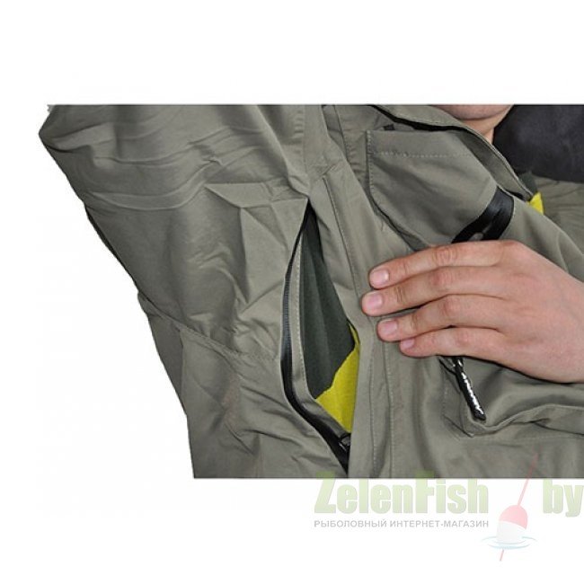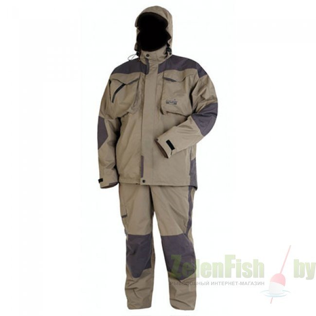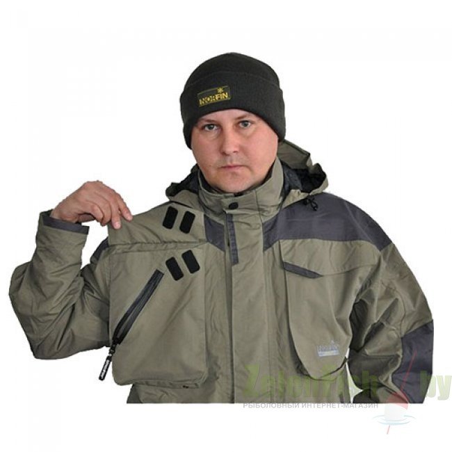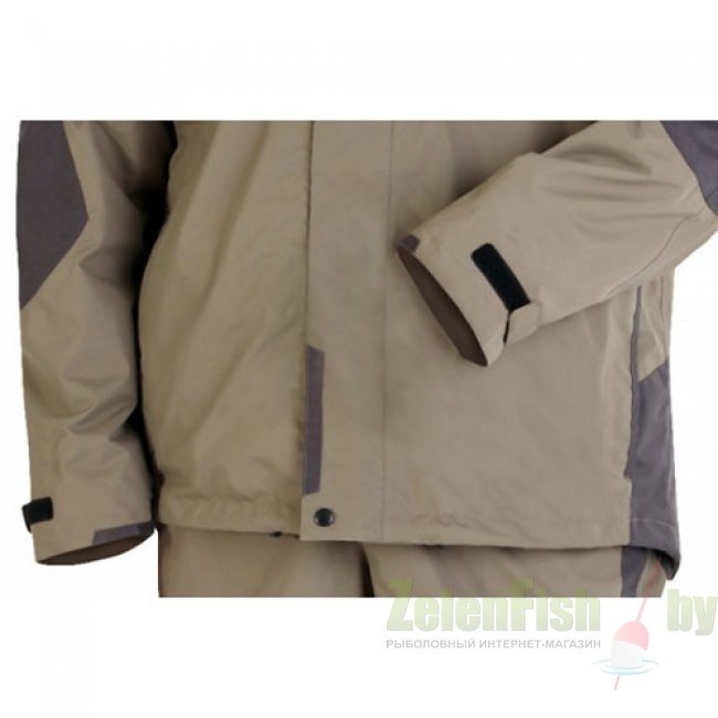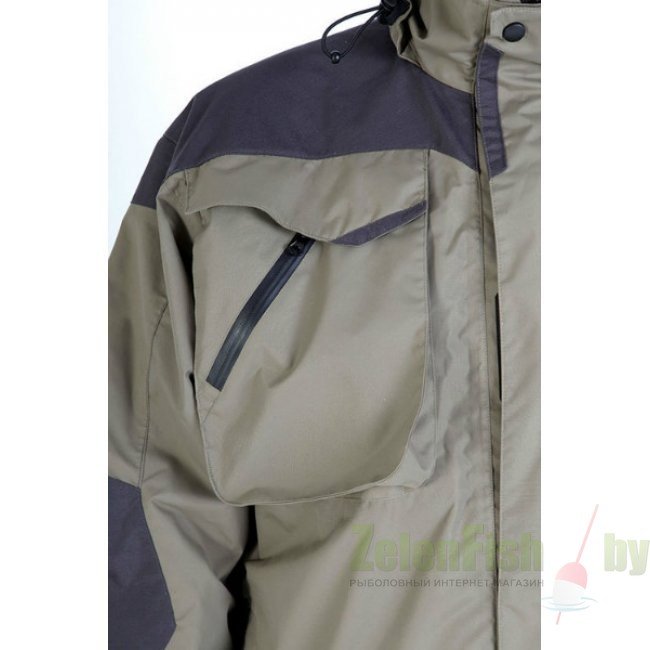 Куртка: два боковых кармана на водонепроницаемой молнии; два больших кармана для рыболовных приманок; внутренние карманы на молниях. Задняя часть удлиненная. Капюшон складывается в 2 уровня. Низ куртки стягивается фиксатором. Имеется сетчатая подкладка, воротник с флисовой отделкой, неопреновые манжеты (регулируются), дополнительная вентиляция подмышек. Стойкие нашивки на плечах и локтях.