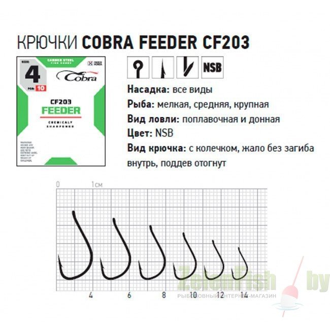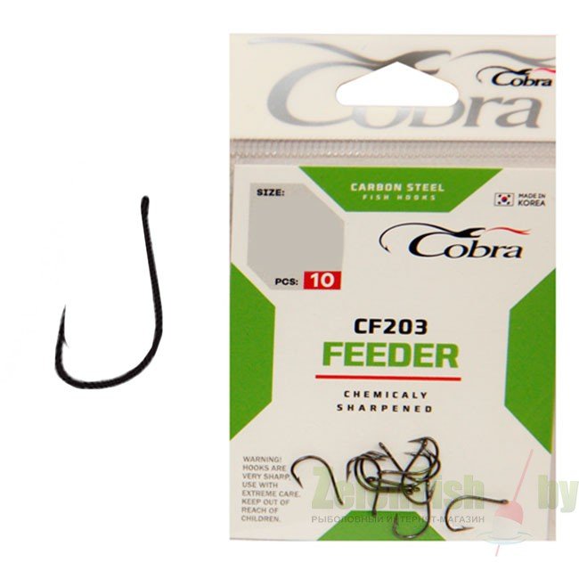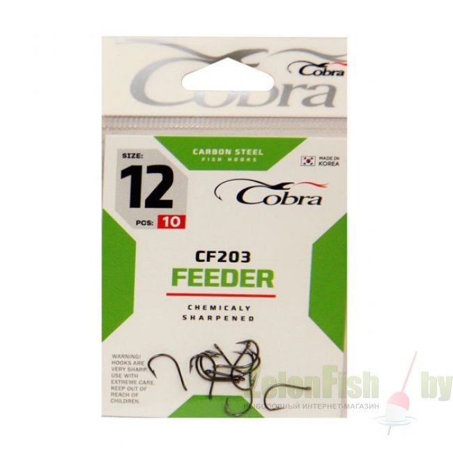 Бренд Cobra представляет серию фидерных крючков, специально разработанных ведущими мировыми спортсменами, для активной ловли рыбы на фидер. Крючки выполнены из высокоуглеродистой стали (Taff Wire), что делает их прочными и устойчивыми к нагрузкам. Крючки держат форму и не деформируются, даже при серьезных нагрузках, зацепах и на вываживании крупной рыбы. Новейшие технологии термообработки и электрохимическая заточка жала крючка позволяет использовать все виды насадок, даже самых капризные, коими являются мотыль и опарыш. На производстве используется лазерный контроль качества заточки, что обеспечивает однородность всей выпускаемой продукции. Стойкое антикоррозийное покрытие.