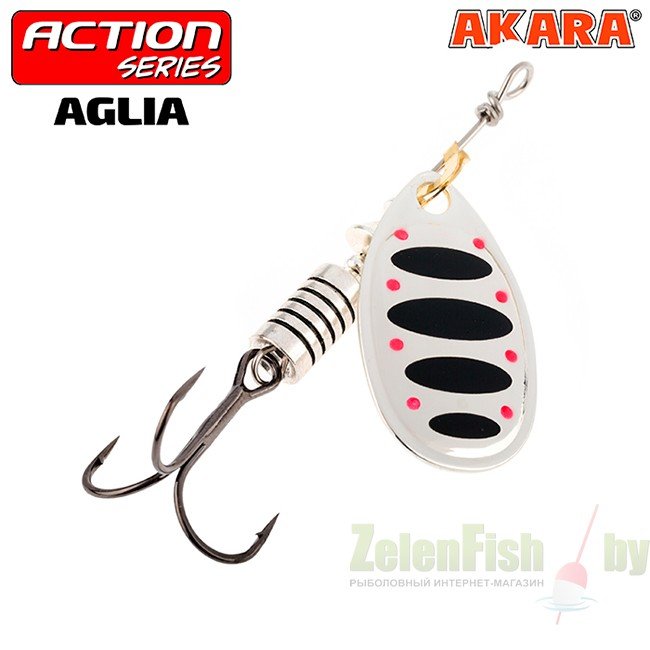 Aglia - классическая блесна от Akara. Универсальная вертушка для ловли на любом типе водоемов. Благодаря большому углу атаки лепестка есть возможность проводки на минимальных скоростях, а при ловли на струе держать блесну без подмотки, давая ей плавно съезжать перпендикулярно течению.