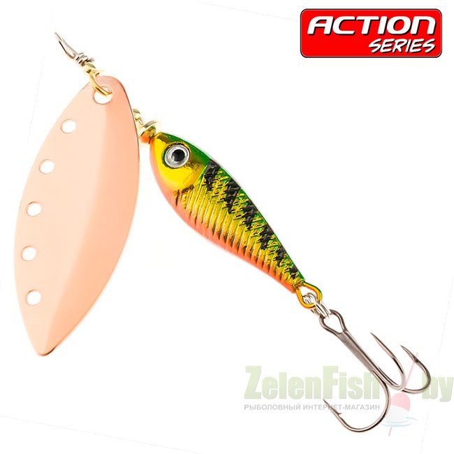 Перфорированный с одной стороны лепесток имеет с одной стороны меньшее лобовое сопротивление чем с другой, что позволяет ему моментально заводиться. Положительные отзывы, показали отличную уловистость этой блесны. Форма лепестка легендарный long, а тело выполнено в виде натуральной рыбки. Есть возможность смены тройника. Номера сердечников: 1, 3, 4.