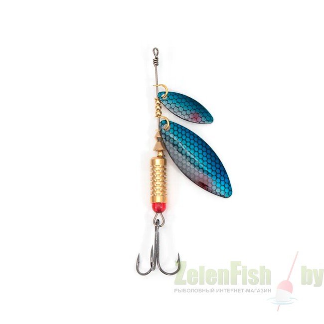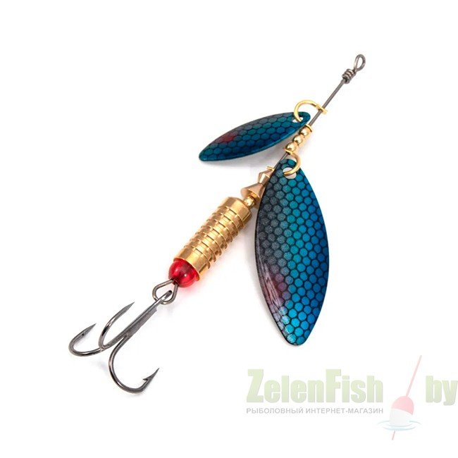 Вертушка-тандем, главный элемент этих блесен – два узких, вытянутых вращающихся лепестка, начинающие свою работу, сразу как блесна начинает движение. Удвоенное количество лепестков обеспечивает дополнительные сигналы, что повышает интерес к блесне даже хитрой рыбы. При этом первый лепесток меньше заднего, поэтому вихри, которые создаются за первым лепестком, не влияют на работу последнего лепестка. Лепесток прикреплен к стержню с помощью хомутика. Оснащена тройным крючком.