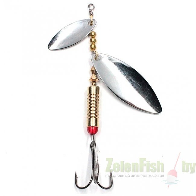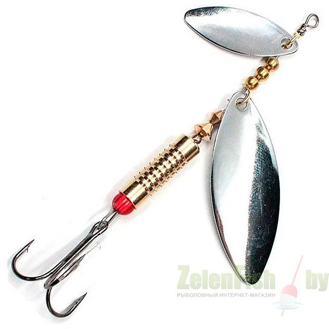 Вертушка-тандем, главный элемент этих блесен – два узких, вытянутых вращающихся лепестка, начинающие свою работу, сразу как блесна начинает движение. Удвоенное количество лепестков обеспечивает дополнительные сигналы, что повышает интерес к блесне даже хитрой рыбы. При этом первый лепесток меньше заднего, поэтому вихри, которые создаются за первым лепестком, не влияют на работу последнего лепестка. Лепесток прикреплен к стержню с помощью хомутика. Оснащена тройным крючком.