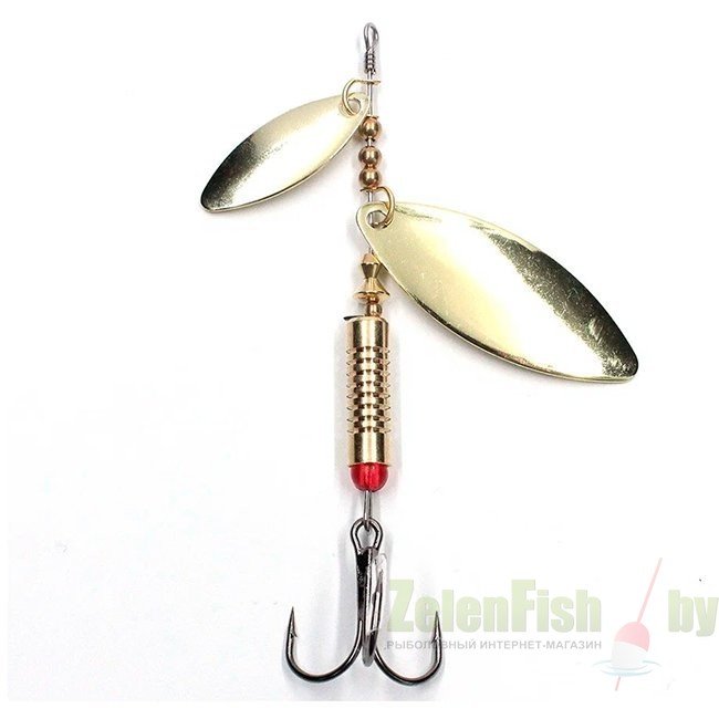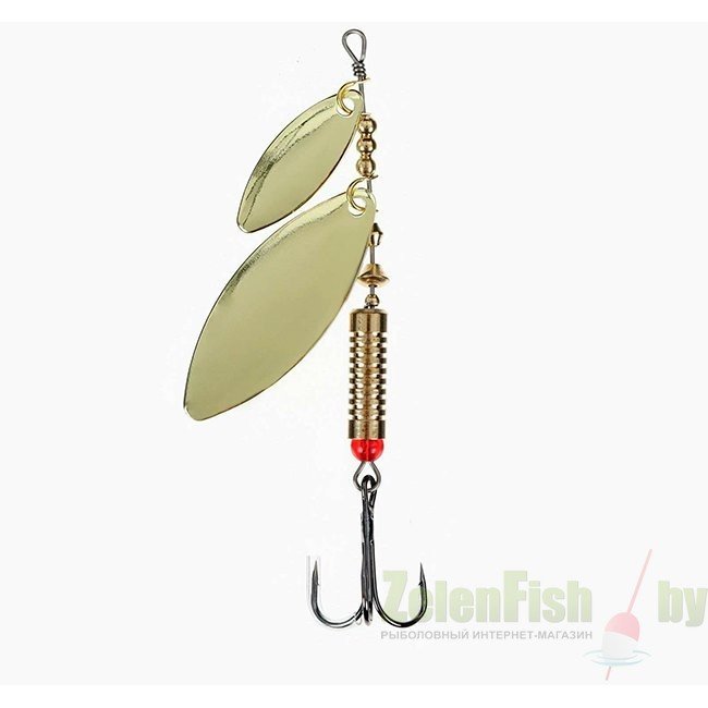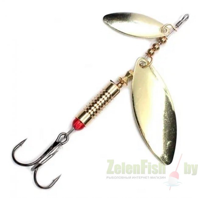Вертушка-тандем, главный элемент этих блесен – два узких, вытянутых вращающихся лепестка, начинающие свою работу, сразу как блесна начинает движение. Удвоенное количество лепестков обеспечивает дополнительные сигналы, что повышает интерес к блесне даже хитрой рыбы. При этом первый лепесток меньше заднего, поэтому вихри, которые создаются за первым лепестком, не влияют на работу последнего лепестка. Лепесток прикреплен к стержню с помощью хомутика. Оснащена тройным крючком.