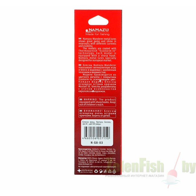 Представленная вертушка из серии Gorana от экспертов Namazu получила вытянутый овальный лепесток с плавным расширением в нижней части. Такая геометрия обеспечивает вращение без сбоев в спокойных акваториях и при наличии слабого течения. Лепесток начинает работать на низкой скорости анимации, потому блесна подойдет для охоты даже за пассивной рыбой. Увесистая приманка имеет вытянутый сердечник, форма которого продумана для улучшения кастинговых показателей. Деталь также имеет глубокое поперечное рифление, которое при движении в воде создает микровибрации. Дополнительно поддразнивать хищника будут колебания перьев, маскирующих тройник. Основная добыча для данного размера вертушки Namazu Gorana - это любопытный окунь и щука. Возможны поклевки крупного голавля.