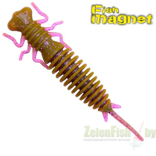 Приманка выполнена из мягкого силикона с добавлением пищевых добавок, представляющая собой имитацию личинки стрекозы. Излюбленная пища хищных, и мирных рыб, это насекомое живет во всех водоемах, перемещается по дну и водным растениям относительно медленно, и легко становится добычей любого из подводных обитателей, кто в силах ее проглотить.