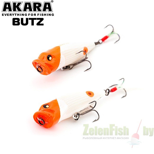 Поппер с реалистичной детализацией головы и тела. Отличительная особенность данной приманки - это специальные каналы в головной выемке (плевалке), пропускающие через себя воду при рывках удилищем. Благодаря этим инновациям поппер Akara Butz кардинально отличается от классических приманок схожего типа. Применяется для ловли в заросших участках водоемов. Кроме привычных для спиннингистов щук и окуней отлично подходит для ловли белого хищника. Приманка снабжена шумовой камерой. Выпускается в двух размерах.
