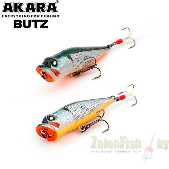 Поппер с реалистичной детализацией головы и тела. Отличительная особенность данной приманки - это специальные каналы в головной выемке (плевалке), пропускающие через себя воду при рывках удилищем. Благодаря этим инновациям поппер Akara Butz кардинально отличается от классических приманок схожего типа. Применяется для ловли в заросших участках водоемов. Кроме привычных для спиннингистов щук и окуней отлично подходит для ловли белого хищника. Приманка снабжена шумовой камерой. Выпускается в двух размерах.