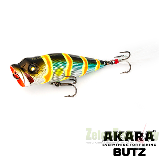 Поппер с реалистичной детализацией головы и тела. Отличительная особенность данной приманки - это специальные каналы в головной выемке (плевалке), пропускающие через себя воду при рывках удилищем. Благодаря этим инновациям поппер Akara Butz кардинально отличается от классических приманок схожего типа. Применяется для ловли в заросших участках водоемов. Кроме привычных для спиннингистов щук и окуней отлично подходит для ловли белого хищника. Приманка снабжена шумовой камерой. Выпускается в двух размерах.