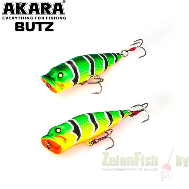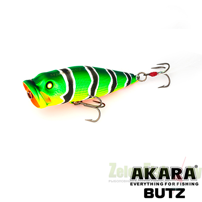 Поппер с реалистичной детализацией головы и тела. Отличительная особенность данной приманки - это специальные каналы в головной выемке (плевалке), пропускающие через себя воду при рывках удилищем. Благодаря этим инновациям поппер Akara Butz кардинально отличается от классических приманок схожего типа. Применяется для ловли в заросших участках водоемов. Кроме привычных для спиннингистов щук и окуней отлично подходит для ловли белого хищника. Приманка снабжена шумовой камерой. Выпускается в двух размерах.