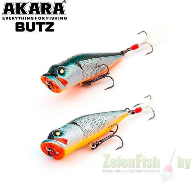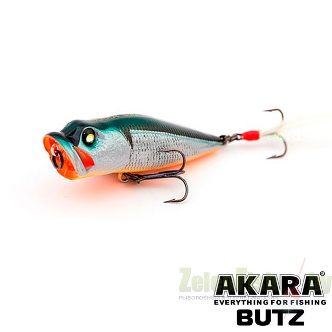 Поппер с реалистичной детализацией головы и тела. Отличительная особенность данной приманки - это специальные каналы в головной выемке (плевалке), пропускающие через себя воду при рывках удилищем. Благодаря этим инновациям поппер Akara Butz кардинально отличается от классических приманок схожего типа. Применяется для ловли в заросших участках водоемов. Кроме привычных для спиннингистов щук и окуней отлично подходит для ловли белого хищника. Приманка снабжена шумовой камерой. Выпускается в двух размерах.