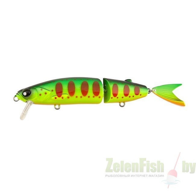 Универсальный воблер-минноу с оригинальным дизайном. Оснащен хвостиком, дополнительно привлекающим хищников. Длина 115 мм при весе 14 грамм. Обладает уникальной игрой в процессе равномерной, или рывковой проводки. Предназначен для точечного облова конкретной акватории. Цвет спинки черный, тело желто-зеленое с красными узорами, животик оранжевый.