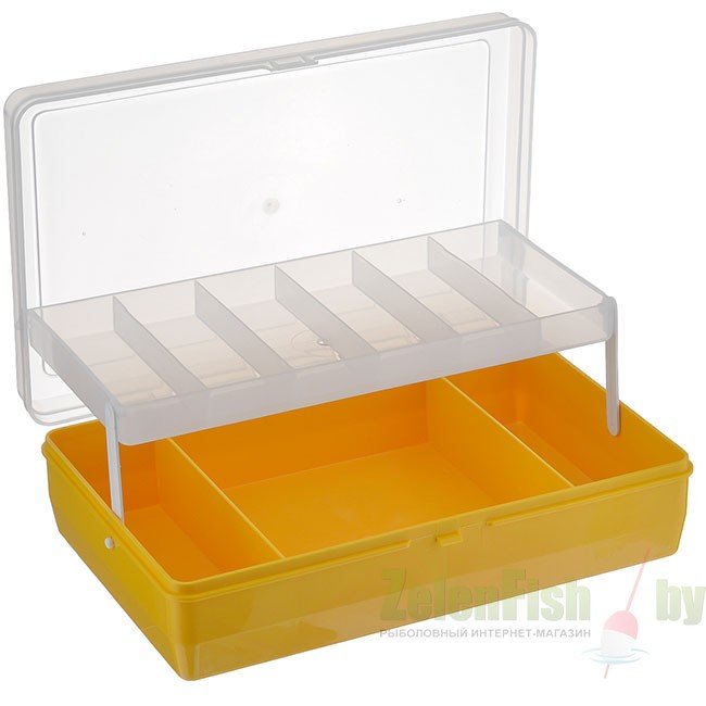 Двухъярусная коробка, изготовлена из высококачественного пластика. Прозрачная крышка позволяет видеть содержимое коробки. Изделие имеет два яруса. Верхний ярус представляет собой съемное отделение, в котором содержится 6 прямоугольных ячеек. Нижний ярус имеет 3 ячейки разного размера. Прекрасно подойдет для хранения рыболовных снастей, мелких деталей и других бытовых мелочей. Удобный и надежный замок-защелка обеспечивает надежное закрывание крышки. Легко моется и чистится.