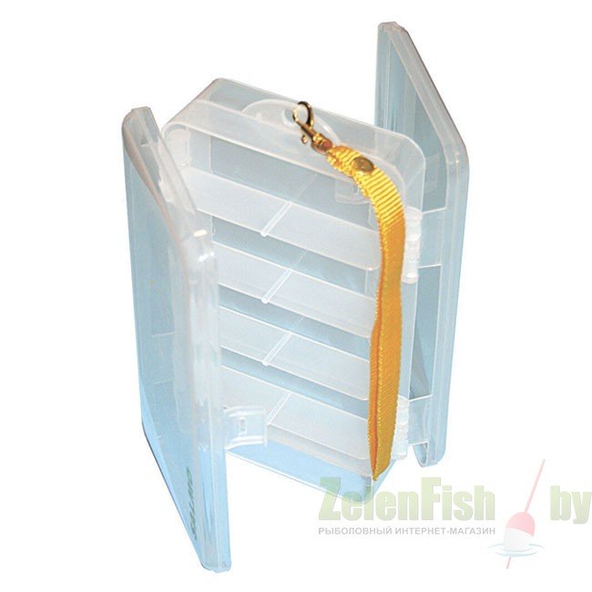 Двусторонняя коробка с отсеками для хранения рыболовных мелочей. Имеется шнурок для переноски.