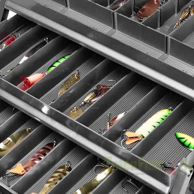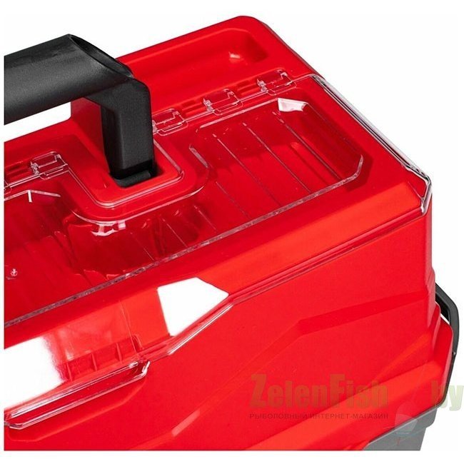 Прочный рыболовный ящик для хранения снастей и приманок. Крышка красного цвета, основание серого. Изготовлен из ударопрочного пластика. Оснащен тремя выдвижными полками (отсеки различных размеров). На крышке отделы, закрывающиеся прозрачной крышкой. Имеется ручка для транспортировки. Вес 1.75 кг.