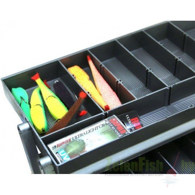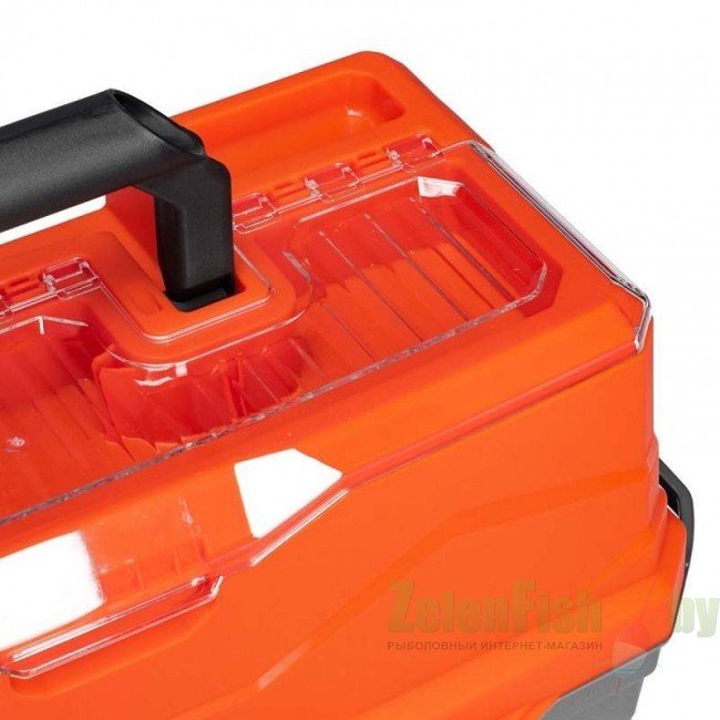 Прочный рыболовный ящик для хранения снастей и приманок. Крышка оранжевого цвета, основание серого. Изготовлен из ударопрочного пластика. Оснащен тремя выдвижными полками (отсеки различных размеров). На крышке отделы, закрывающиеся прозрачной крышкой. Имеется ручка для транспортировки. Вес 1.75 кг.