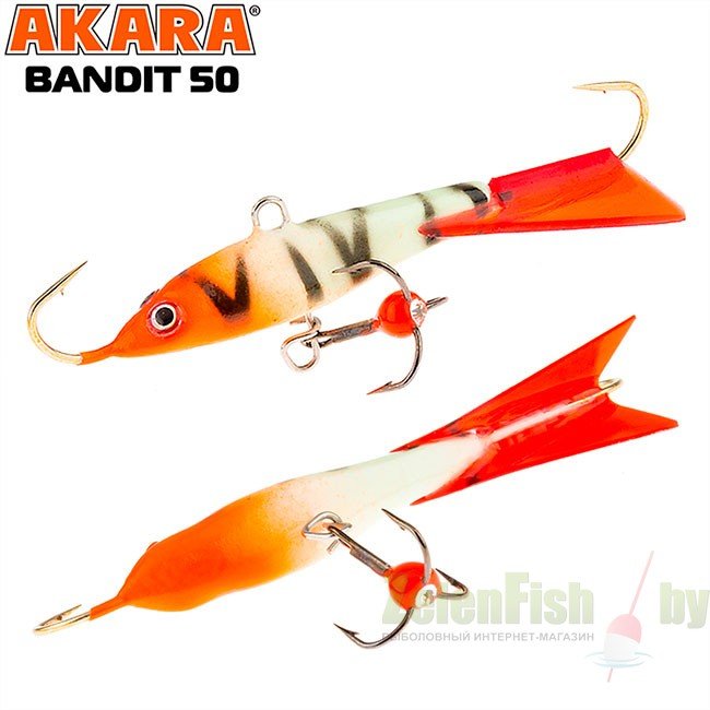Балансир Akara Bandit 50 - разработан для зимней рыбалки, является популярной и эффективной приманкой для ловли окуня. Балансир изготовлен из качественных, морозостойких материалов и оснащен высокопрочными крючками и тройниками японской компании Maruto. Длинна балансира 50 миллиметров, вес – 10 грамм. Балансиры этой модели красятся в уловистые цвета, причем окрашивание осуществляется с применением флуоресцентных UV красок (светятся в ультрафиолетовом диапазоне), либо с использованием люминесцентных фосфорных красок (светятся в темноте). Существуют также варианты двухсторонней окраски. Балансир имеет акцентированную, стабильную и предсказуемую игру, легко отзывается на анимацию и прекрасно подойдет не только опытным любителям зимней рыбалки, но и начинающим рыболовам.