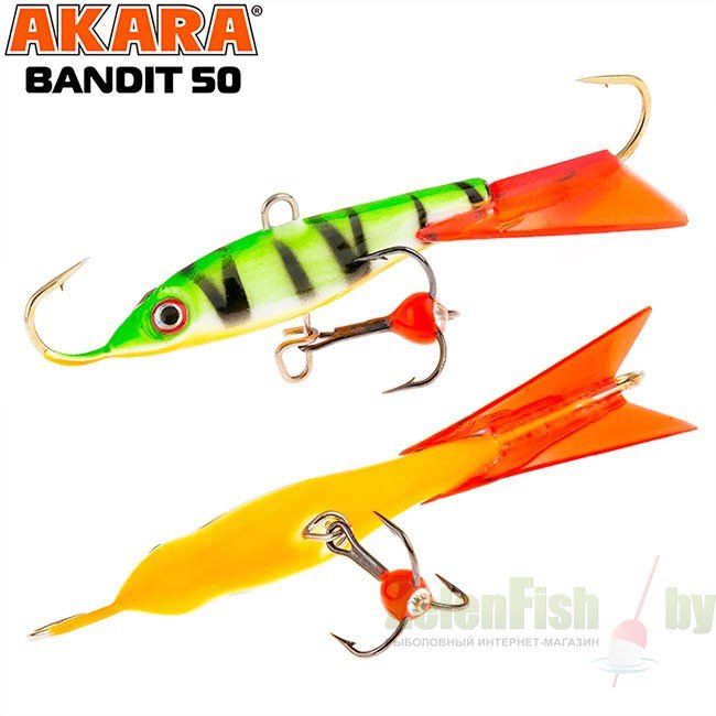 Балансир Akara Bandit 50 - разработан для зимней рыбалки, является популярной и эффективной приманкой для ловли окуня. Балансир изготовлен из качественных, морозостойких материалов и оснащен высокопрочными крючками и тройниками японской компании Maruto. Длинна балансира 50 миллиметров, вес – 10 грамм. Балансиры этой модели красятся в уловистые цвета, причем окрашивание осуществляется с применением флуоресцентных UV красок (светятся в ультрафиолетовом диапазоне), либо с использованием люминесцентных фосфорных красок (светятся в темноте). Существуют также варианты двухсторонней окраски. Балансир имеет акцентированную, стабильную и предсказуемую игру, легко отзывается на анимацию и прекрасно подойдет не только опытным любителям зимней рыбалки, но и начинающим рыболовам.