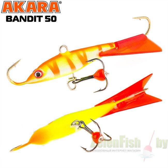 Балансир Akara Bandit 50 - разработан для зимней рыбалки, является популярной и эффективной приманкой для ловли окуня. Балансир изготовлен из качественных, морозостойких материалов и оснащен высокопрочными крючками и тройниками японской компании Maruto. Длинна балансира 50 миллиметров, вес – 10 грамм. Балансиры этой модели красятся в уловистые цвета, причем окрашивание осуществляется с применением флуоресцентных UV красок (светятся в ультрафиолетовом диапазоне), либо с использованием люминесцентных фосфорных красок (светятся в темноте). Существуют также варианты двухсторонней окраски. Балансир имеет акцентированную, стабильную и предсказуемую игру, легко отзывается на анимацию и прекрасно подойдет не только опытным любителям зимней рыбалки, но и начинающим рыболовам.