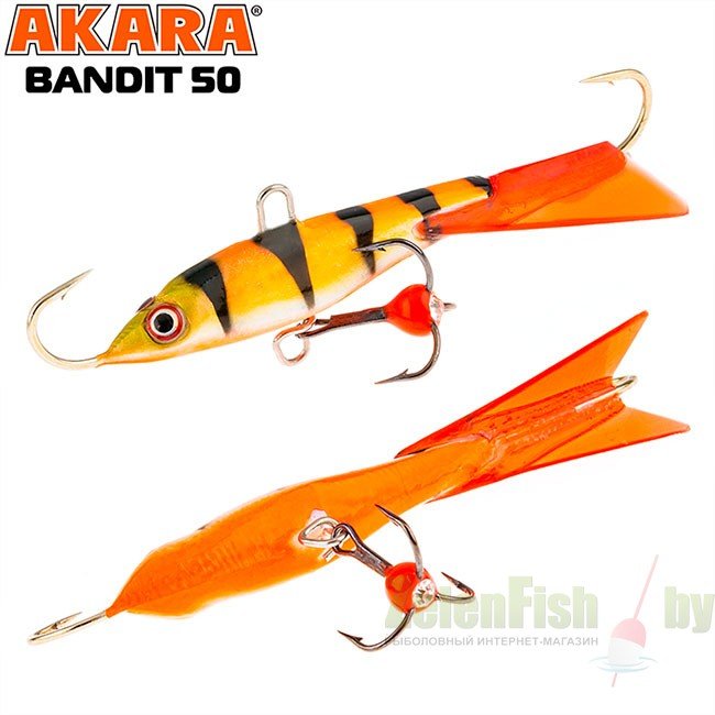Балансир Akara Bandit 50 - разработан для зимней рыбалки, является популярной и эффективной приманкой для ловли окуня. Балансир изготовлен из качественных, морозостойких материалов и оснащен высокопрочными крючками и тройниками японской компании Maruto. Длинна балансира 50 миллиметров, вес – 10 грамм. Балансиры этой модели красятся в уловистые цвета, причем окрашивание осуществляется с применением флуоресцентных UV красок (светятся в ультрафиолетовом диапазоне), либо с использованием люминесцентных фосфорных красок (светятся в темноте). Существуют также варианты двухсторонней окраски. Балансир имеет акцентированную, стабильную и предсказуемую игру, легко отзывается на анимацию и прекрасно подойдет не только опытным любителям зимней рыбалки, но и начинающим рыболовам.