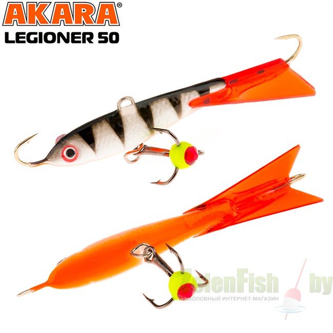 Балансир Akara Legioner 50 разработан для зимней ловли хищных рыб, таких как окунь и судак. Балансир изготовлен из качественных, морозостойких материалов и оснащен высокопрочными крючками и тройниками японской компании Maruto. Длина балансира 50 миллиметров, вес - 9 грамм. Балансиры этой модели красятся в уловистые цвета, причем окрашивание осуществляется с применением флуоресцентных UV красок (светятся в ультрафиолетовом диапазоне), либо с использованием люминесцентных фосфорных красок (светятся в темноте). Балансир прекрасно отзывается на анимацию и имеет яркую, высокоамплитудную игру, которая может спровоцировать на поклевку даже пассивного хищника. Станет прекрасным пополнением арсенала любителей зимней рыбалки.