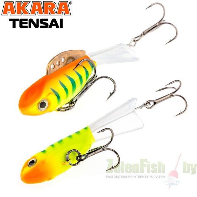 Балансир для отвесной ловли. Данный балансир, пластиковый со свинцовым сердечником, разработан для ловли в отвес, как зимой, так и летом. Балансиры Акара Тенсай изготовлены из качественных морозостойких материалов и выпускаются в длине 57 и 67 мм, оснащены высокопрочными крючками и тройниками японской компании Maruto. Все приманки красятся в уловистые цвета, специальными финскими красками. Особенностью данных балансиров является возможность выбора варианта игры в воде. Это достигается за счет трех способов крепления на латунном верхнем плавнике балансира.