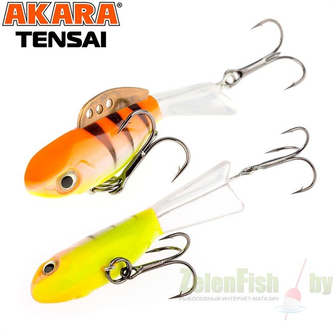 Балансир для отвесной ловли. Данный балансир, пластиковый со свинцовым сердечником, разработан для ловли в отвес, как зимой, так и летом. Балансиры Акара Тенсай изготовлены из качественных морозостойких материалов и выпускаются в длине 57 и 67 мм, оснащены высокопрочными крючками и тройниками японской компании Maruto. Все приманки красятся в уловистые цвета, специальными финскими красками. Особенностью данных балансиров является возможность выбора варианта игры в воде. Это достигается за счет трех способов крепления на латунном верхнем плавнике балансира.