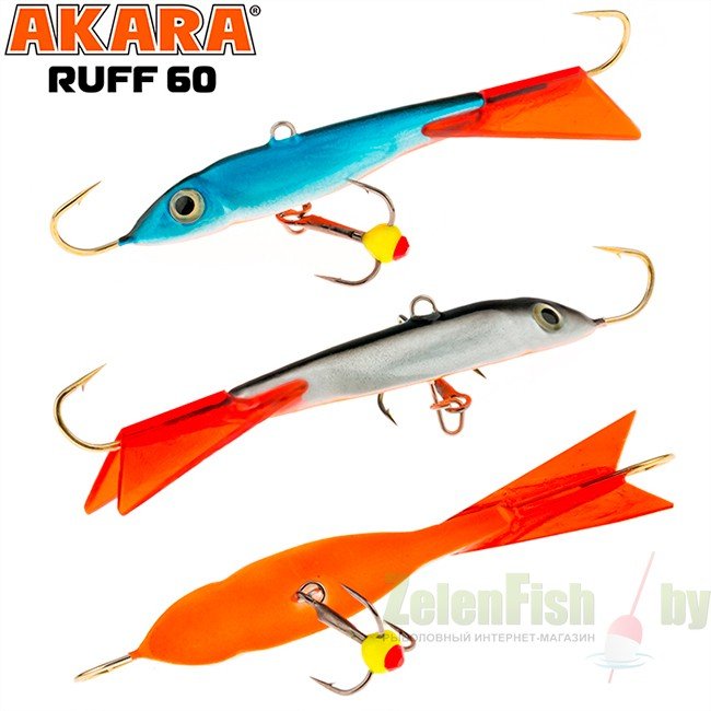 Достаточно крупный балансир длинной 50 миллиметров и весом 9 грамм. Приманка оснащена двумя качественными высокопрочными крючками и тройником японской компании Maruto. Тройник крепится на быстросъемной застежке, что дает возможность моментально демонтировать или заменить тройник в случае необходимости. Хвост балансира сделан из прочного морозостойкого пластика и не становится хрупким на холоде, что повышает надежность и срок эксплуатации. Балансир Akara Ruff показывает спокойную, плавную и изматывающую игру, на которую очень хорошо реагирует судак. Также этот балансир часто используется для ловли в контакте со дном. Akara Ruff окрашивается в контрастные уловистые цвета с применением флуоресцентных UV красок (светятся в ультрафиолетовом диапазоне). Существуют также варианты двухсторонней окраски и окраски с использованием люминесцентных фосфорных красок.