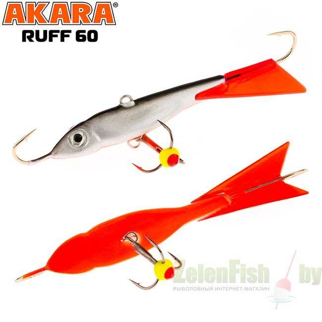 Достаточно крупный балансир длинной 50 миллиметров и весом 9 грамм. Приманка оснащена двумя качественными высокопрочными крючками и тройником японской компании Maruto. Тройник крепится на быстросъемной застежке, что дает возможность моментально демонтировать или заменить тройник в случае необходимости. Хвост балансира сделан из прочного морозостойкого пластика и не становится хрупким на холоде, что повышает надежность и срок эксплуатации. Балансир Akara Ruff показывает спокойную, плавную и изматывающую игру, на которую очень хорошо реагирует судак. Также этот балансир часто используется для ловли в контакте со дном. Akara Ruff окрашивается в контрастные уловистые цвета с применением флуоресцентных UV красок (светятся в ультрафиолетовом диапазоне). Существуют также варианты двухсторонней окраски и окраски с использованием люминесцентных фосфорных красок.