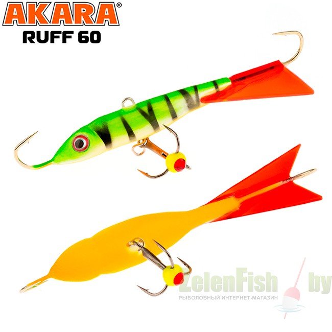 Достаточно крупный балансир длинной 50 миллиметров и весом 9 грамм. Приманка оснащена двумя качественными высокопрочными крючками и тройником японской компании Maruto. Тройник крепится на быстросъемной застежке, что дает возможность моментально демонтировать или заменить тройник в случае необходимости. Хвост балансира сделан из прочного морозостойкого пластика и не становится хрупким на холоде, что повышает надежность и срок эксплуатации. Показывает спокойную, плавную и изматывающую игру, на которую очень хорошо реагирует судак. Также этот балансир часто используется для ловли в контакте со дном. Akara Ruff окрашивается в контрастные уловистые цвета с применением флуоресцентных UV красок (светятся в ультрафиолетовом диапазоне). Существуют также варианты двухсторонней окраски и окраски с использованием люминесцентных фосфорных красок.