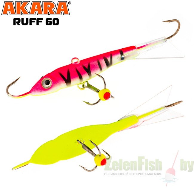 Достаточно крупный балансир длинной 50 миллиметров и весом 9 грамм. Приманка оснащена двумя качественными высокопрочными крючками и тройником японской компании Maruto. Тройник крепится на быстросъемной застежке, что дает возможность моментально демонтировать или заменить тройник в случае необходимости. Хвост балансира сделан из прочного морозостойкого пластика и не становится хрупким на холоде, что повышает надежность и срок эксплуатации. Показывает спокойную, плавную и изматывающую игру, на которую очень хорошо реагирует судак. Также этот балансир часто используется для ловли в контакте со дном. Akara Ruff окрашивается в контрастные уловистые цвета с применением флуоресцентных UV красок (светятся в ультрафиолетовом диапазоне). Существуют также варианты двухсторонней окраски и окраски с использованием люминесцентных фосфорных красок.