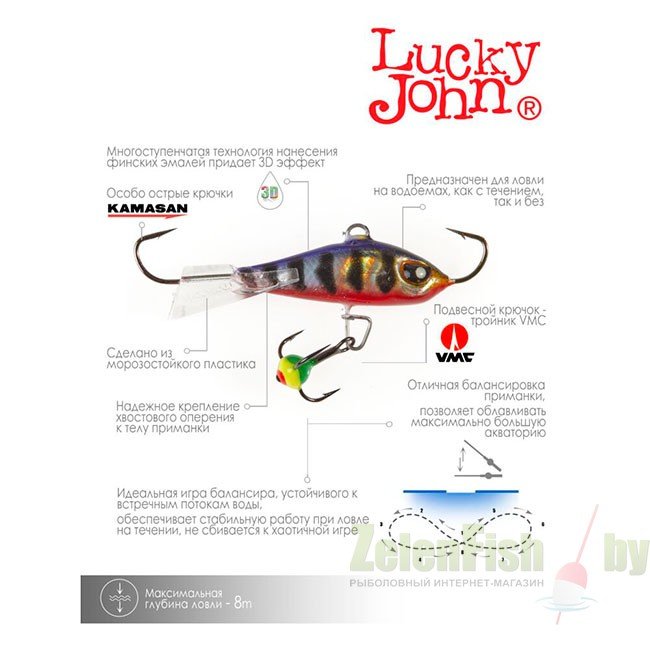 Предназначен для ловли с течением или без него на глубоких водоемах. Модели с символом "Н" обладают голографической расцветкой. Балансир оснащен крючком Kamasan (Япония), продается в индивидуальной упаковке. Тройник VMC с яркой пластиковой каплей.