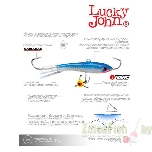 Самая популярная модель балансиров среди рыболовов. Жесткий пластиковый хвостик придает приманке более размашистую и быструю игру. Во время активности хищника, с можно добиться наилучших результатов. Обратите внимание в ассортименте Lucky John существуют две расцветки хвостового оперения - красная и бесцветная. Балансир для ловли крупного окуня, берша, судака и щуки. Длина 60 мм. Для ловли судака его с успехом можно использовать на глубинах до 13 метров, если на водоеме нет течения.