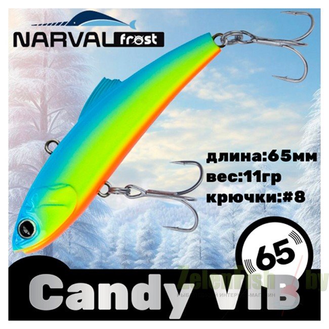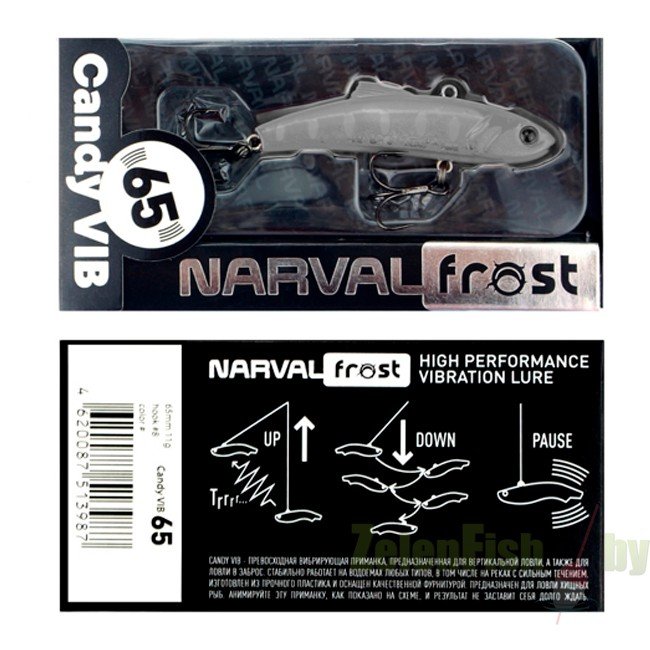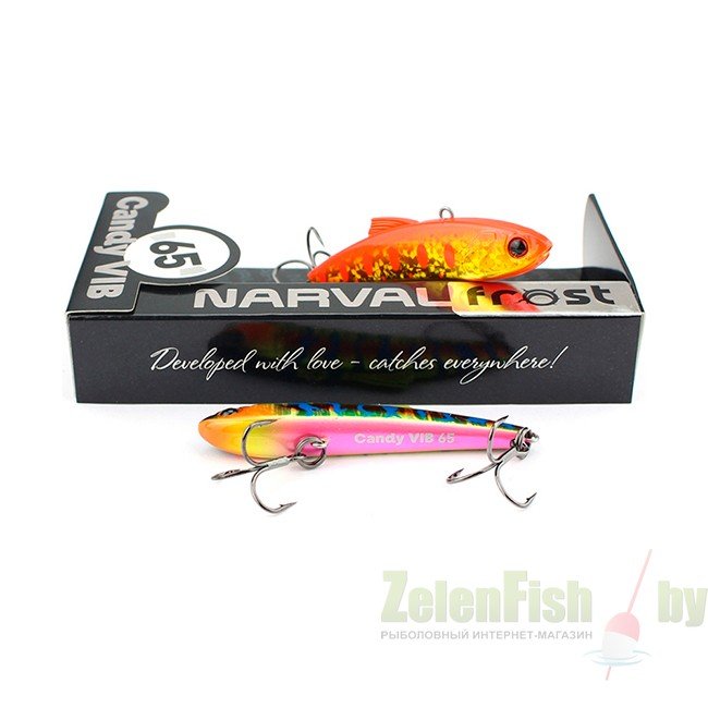 Спиннинговая приманка типа VIB/Rattlin. Приманки подобного типа давно пользуются большим успехом у рыболовов, кто предпочитает ловить крупного донного хищника на больших глубинах, например, судака, щуку или крупного донного окуня. Разнообразная UV-цветовая палитра, включая как натуралистичные окрасы, так и яркие «кислотные» оттенки, быстрое включение в работу, уверенная игра, а какие траектории они выписывают, хищник просто не силах устоять и атакует приманку. Narval Frost Candy Vib очень актуален не только по открытой воде при ловле в заброс и в вертикальном джиггинге, но и зимой из-подо льда. На вооружении приманки стоит пара острых прочных тройников.