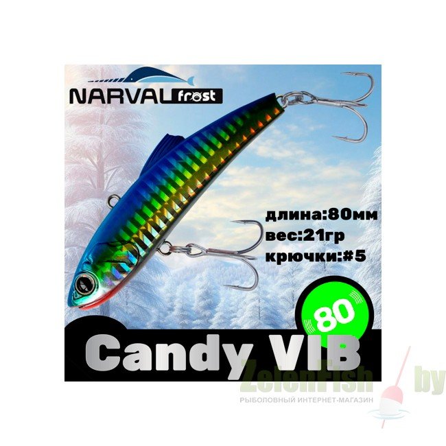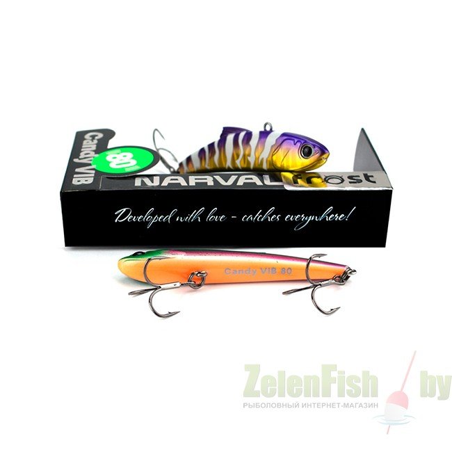 Спиннинговая приманка типа VIB/Rattlin. Приманки подобного типа давно пользуются большим успехом у рыболовов, кто предпочитает ловить крупного донного хищника на больших глубинах, например, судака, щуку или крупного донного окуня. Разнообразная UV-цветовая палитра, включая как натуралистичные окрасы, так и яркие «кислотные» оттенки, быстрое включение в работу, уверенная игра, а какие траектории они выписывают, хищник просто не силах устоять и атакует приманку. Narval Frost Candy Vib очень актуален не только по открытой воде при ловле в заброс и в вертикальном джиггинге, но и зимой из-подо льда. На вооружении приманки стоит пара острых прочных тройников.