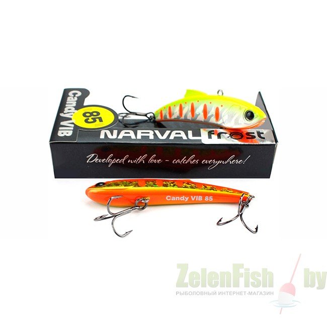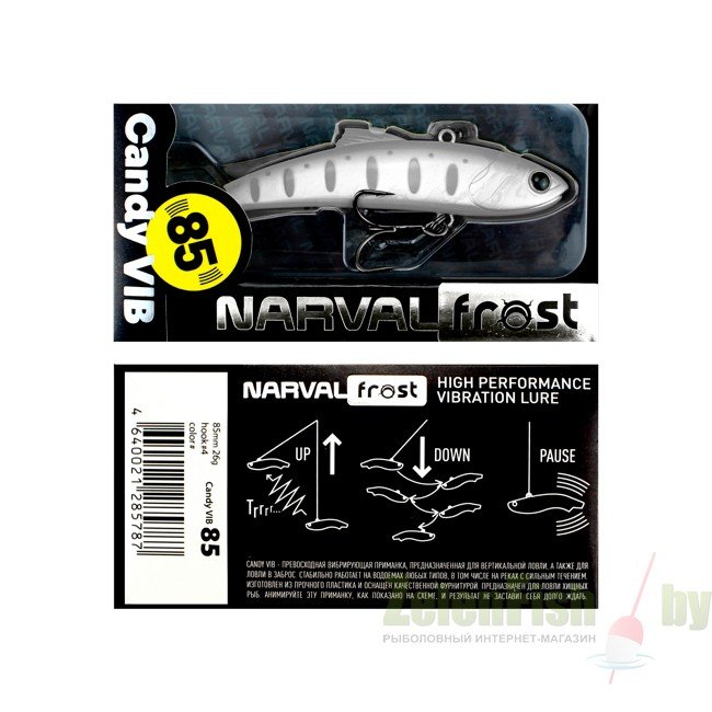 Спиннинговая приманка типа VIB/Rattlin. Приманки подобного типа давно пользуются большим успехом у рыболовов, кто предпочитает ловить крупного донного хищника на больших глубинах, например, судака, щуку или крупного донного окуня. Разнообразная UV-цветовая палитра, включая как натуралистичные окрасы, так и яркие «кислотные» оттенки, быстрое включение в работу, уверенная игра, а какие траектории они выписывают, хищник просто не силах устоять и атакует приманку. Narval Frost Candy Vib очень актуален не только по открытой воде при ловле в заброс и в вертикальном джиггинге, но и зимой из-подо льда. На вооружении приманки стоит пара острых прочных тройников.