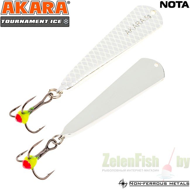 Блесна зимняя Akara Tournament Ice Nota выпускается в двух размерах 35 и 45 мм и в основном рассчитана на ловлю окуня. Отличается гвоздящей игрой и отлично работает по активной рыбе. При широких взмахах имеет отклонение в сторону, что так же привлекает рыбу.