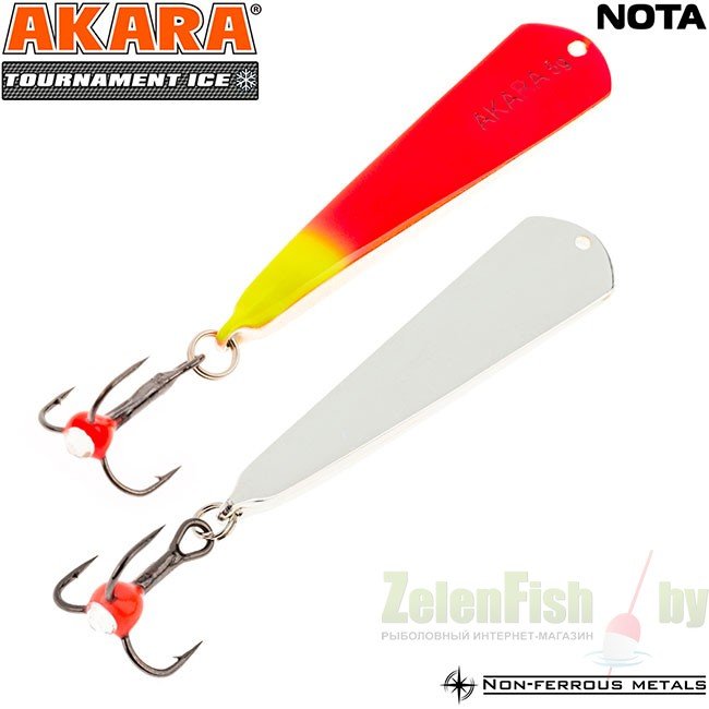 Блесна зимняя Akara Tournament Ice Nota выпускается в двух размерах 35 и 45 мм и в основном рассчитана на ловлю окуня. Отличается гвоздящей игрой и отлично работает по активной рыбе. При широких взмахах имеет отклонение в сторону, что так же привлекает рыбу.