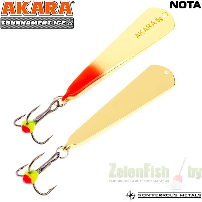 Блесна зимняя Akara Tournament Ice Nota выпускается в двух размерах 35 и 45 мм и в основном рассчитана на ловлю окуня. Отличается гвоздящей игрой и отлично работает по активной рыбе. При широких взмахах имеет отклонение в сторону, что так же привлекает рыбу.