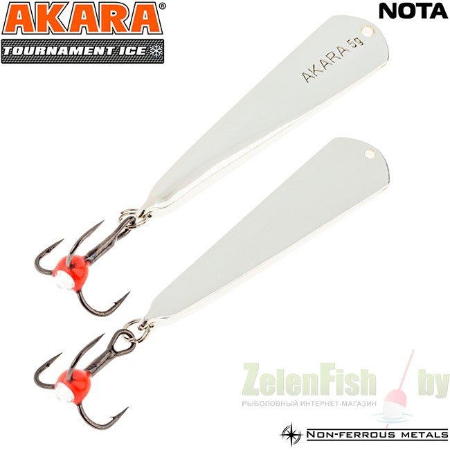Блесна зимняя Akara Tournament Ice Nota выпускается в двух размерах 35 и 45 мм и в основном рассчитана на ловлю окуня. Отличается гвоздящей игрой и отлично работает по активной рыбе. При широких взмахах имеет отклонение в сторону, что так же привлекает рыбу.