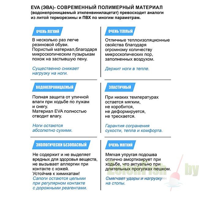 Сапоги из материала EVA, очень легкие и теплые. Этот материал обеспечивает отличную теплоизоляцию, сохраняет ноги в тепле в холодную погоду. Благодаря своей легкости, сапоги не создают дополнительной нагрузки при ходьбе, обеспечивая комфорт и удобство в течение всего дня. Стелька предохраняет утеплитель от истирания, препятствует намоканию вкладыша от конденсата и действует как дополнительная прослойка для удержания тепла. Рекомендуемая температура эксплуатации до -15 градусов. Идеальный выбор для тех, кто ценит сочетание функциональности и комфорта.