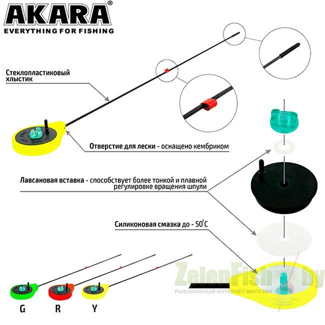 Удочка зимняя Akara SPZ-Y - современная зимняя удочка типа «балалайка». Изготавливается из сверхпрочного морозостойкого пенопласта, окрашивается в яркие цвета для лучшей видимости на льду и снегу. Отверстие для лески в корпусе удочки оснащено кембриком. Лавсановая вставка под шпулей катушки предназначена для более плавной и точной регулировки вращения катушки. Хлыстик стеклопластиковый. Длина 26.5 см при весе 14 грамм. Тест 0.5-6 грамм.